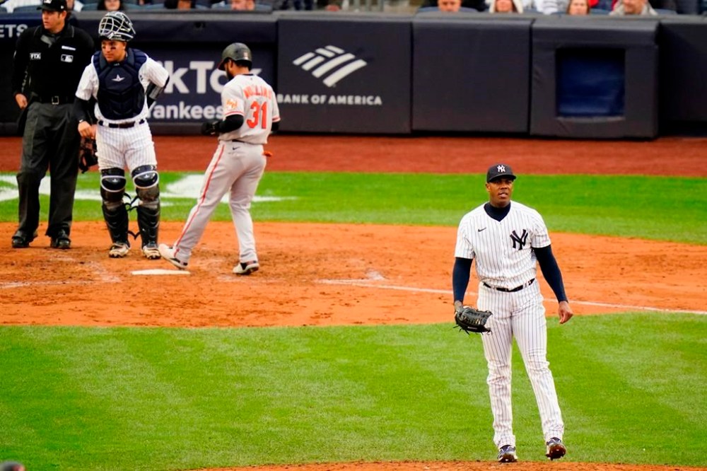 Aroldis Chapman (3-4) walked three as Baltimore surged ahead in a two-run seventh that included Austin Hays’ sacrifice fly off Marinaccio. Chapman has walked 28 in 35 1/3 innings, and his postseason roster spot may be in jeopardy.