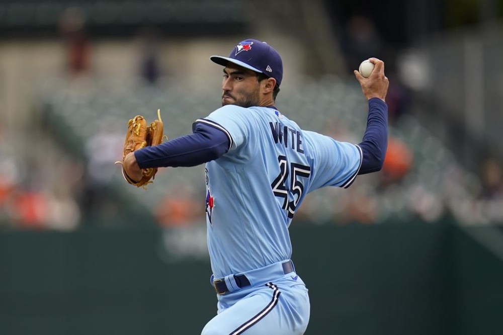 Toronto Blue Jays relief pitcher Mitch White throws a pitch to the Baltimore Orioles during the fifth inning of a baseball game, Wednesday, Oct. 5, 2022, in Baltimore. (AP Photo/Julio Cortez)
