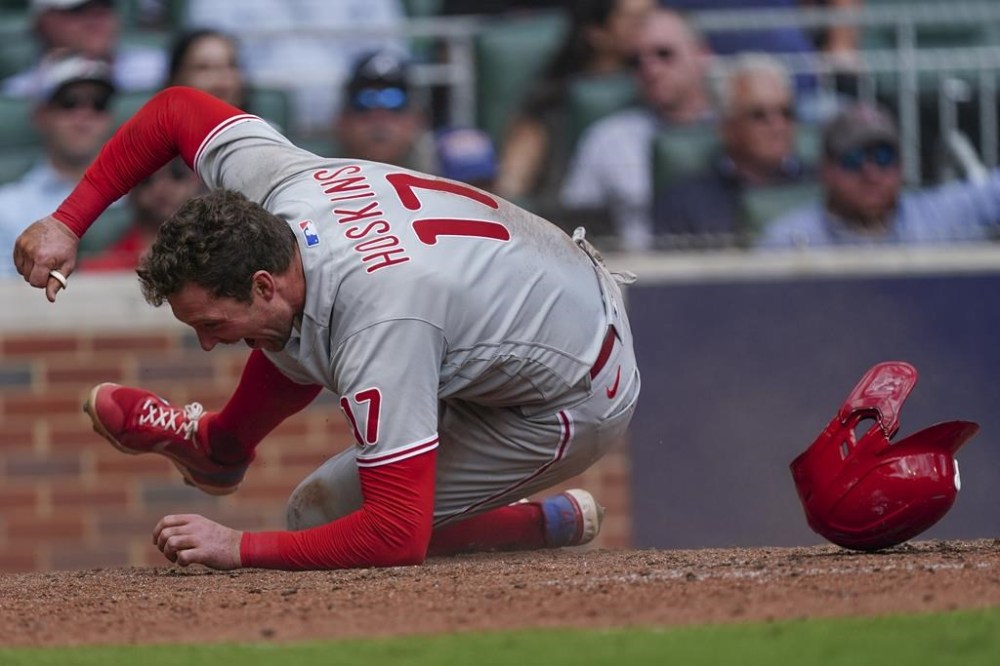 Philadelphia Phillies first baseman Rhys Hoskins (17) scores on a Philadelphia Phillies right fielder Nick Castellanos (8) single during the fourth inning in Game 1 of a National League Division Series baseball game, Tuesday, Oct. 11, 2022, in Atlanta. (AP Photo/John Bazemore)
