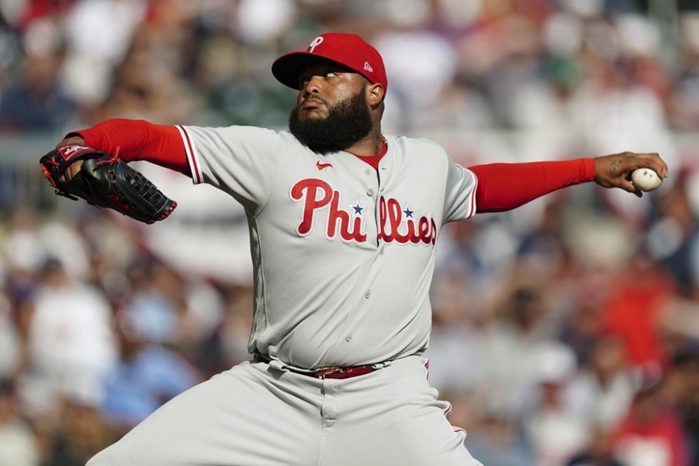 Philadelphia Phillies relief pitcher Jose Alvarado (46) during the eighth inning in Game 1 of a National League Division Series baseball game between the Atlanta Braves and the Philadelphia Phillies, Tuesday, Oct. 11, 2022, in Atlanta. The Philadelphia Phillies won 7-6. (AP Photo/John Bazemore)
