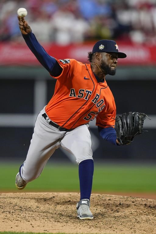 PHILADELPHIA (AP) — Cristian Javier, Bryan Abreu and Rafael Montero held the Philadelphia Phillies hitless through eight innings in Game 4 of the World Series on Wednesday night, and the Houston Astros led 5-0 after knocking out Aaron Nola in a five-run fifth.