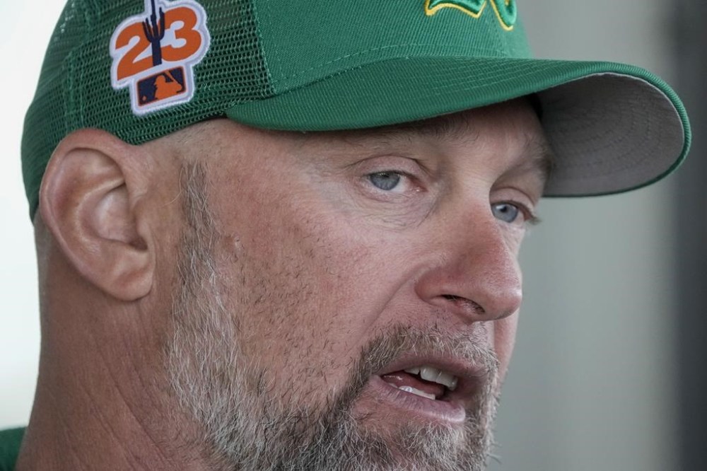 Oakland Athletics manager Mark Kotsay answers questions during a spring training baseball workout Monday, Feb. 20, 2023, in Mesa, Ariz. (AP Photo/Morry Gash)