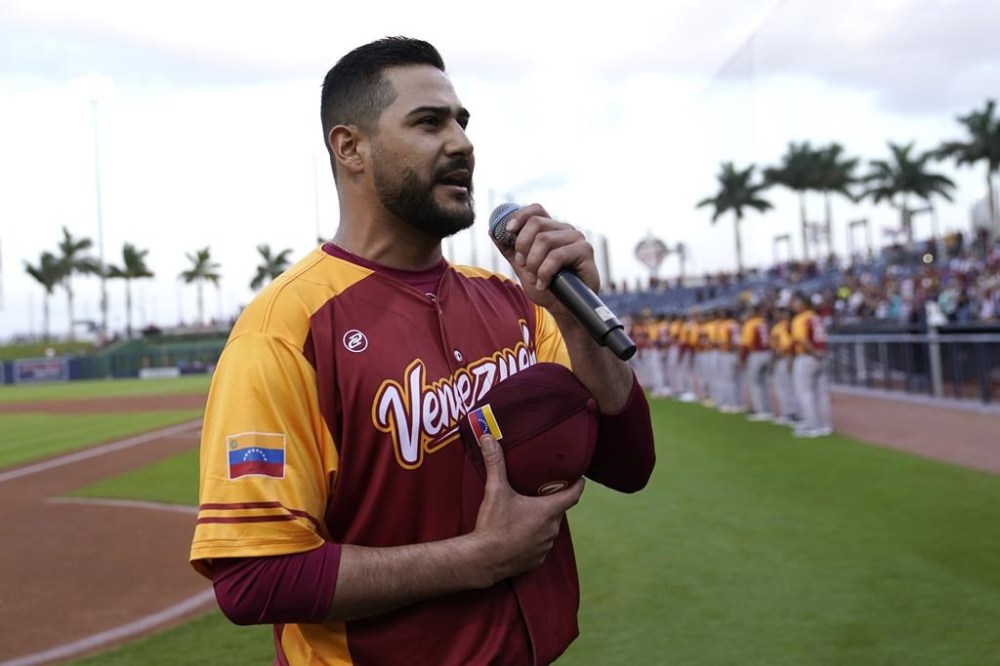 Pérez sang the Venezuelan national anthem before the team played an exhibition game Wednesday night against the Houston Astros.