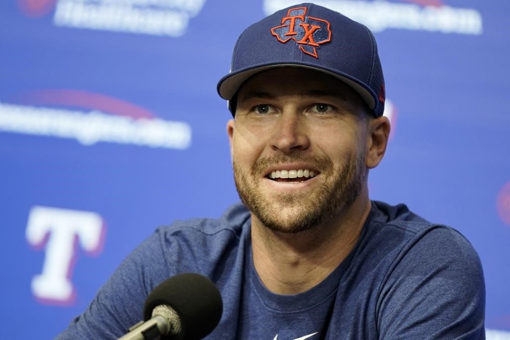 Texas Rangers starting pitcher Jacob deGrom takes questions from media before a spring training baseball game against the Kansas City Royals on Tuesday, March 28, 2023, in Arlington, Texas. (AP Photo/Sam Hodde)