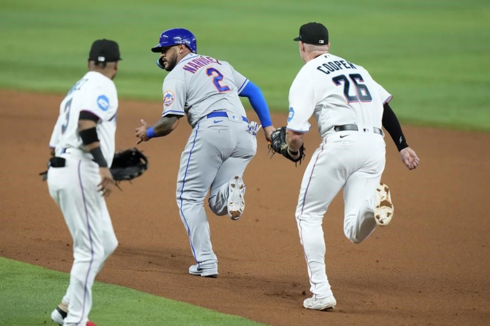 Nimmo had three RBIs from the leadoff spot after re-signing with the Mets in the offseason for $162 million over eight years. He ripped a low slider from reliever Tanner Scott (0-1) into center field to put New York ahead 5-3 in the seventh, propelling the Mets to their 41st win in the past 53 openers.