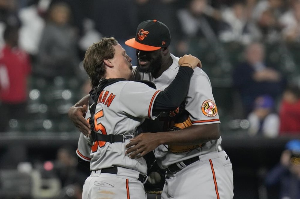 Baltimore Orioles catcher Adley Rutschman, left, and relief pitcher Felix Bautista hug after winning a baseball game against the Chicago White Sox, Friday, April 14, 2023, in Chicago. (AP Photo/Erin Hooley)