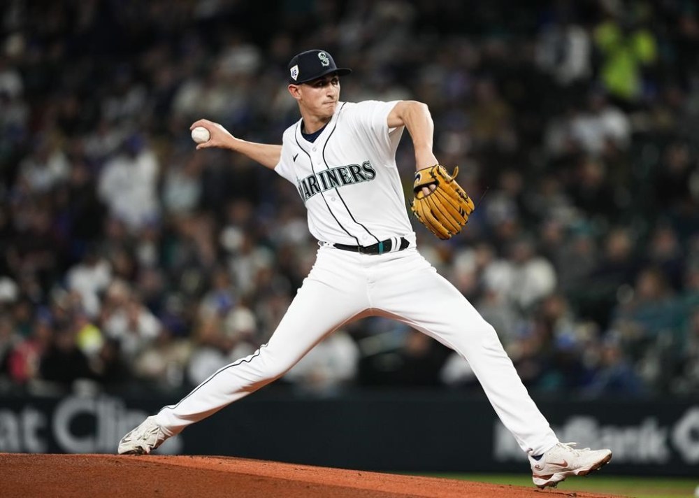Seattle Mariners starting pitcher George Kirby throws to a Colorado Rockies batter during the first inning of a baseball game Saturday, April 15, 2023, in Seattle. (AP Photo/Lindsey Wasson)