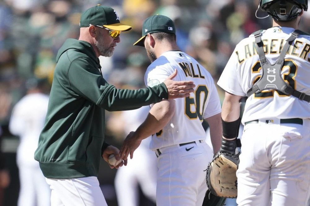 Oakland Athletics manager Mark Kotsay, left, makes a pitching change as he relieves pitcher Sam Moll (60) during the 10th inning of a baseball game against the New York Mets in Oakland, Calif., Sunday, April 16, 2023. (AP Photo/Jeff Chiu)