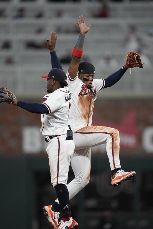 Atlanta Braves' Ozzie Albies, left,and Ronald Acuna Jr. celebrate the team's win over the Miami Marlins in a baseball game Tuesday, April 25, 2023, in Atlanta. (AP Photo/John Bazemore)