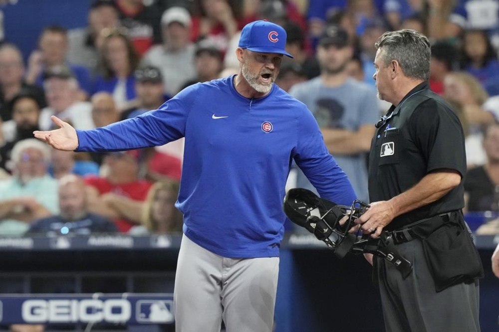 Chicago Cubs manager David Ross talks to the home plate umpire during the first inning of a baseball game against the Miami Marlins, Saturday, April 29, 2023, in Miami. (AP Photo/Marta Lavandier)