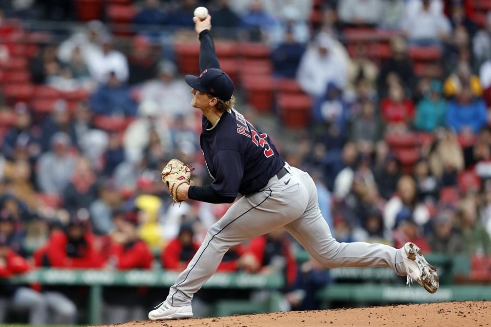 Cleveland Guardians' Zach Plesac pitches against the Boston Red Sox during the first inning of a baseball game, Saturday, April 29, 2023, in Boston. (AP Photo/Michael Dwyer)