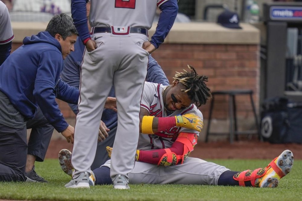 NEW YORK (AP) — Atlanta Braves star Ronald Acuña Jr. was removed from the second game of Monday’s doubleheader against the New York Mets with a bruised left shoulder after getting hit by a 93 mph fastball from Tylor Megill.