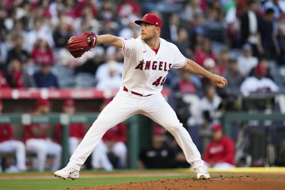 Los Angeles Angels starting pitcher Reid Detmers throws against the Texas Rangers during the second inning of a baseball game Saturday, May 6, 2023, in Anaheim, Calif. (AP Photo/Jae C. Hong)