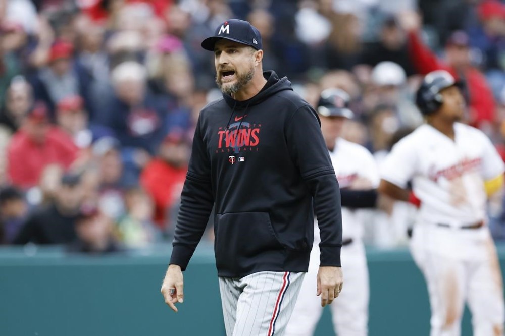Minnesota Twins manager Rocco Baldelli walks off the field after being ejected for arguing a call during the fourth inning of a baseball game against the Cleveland Guardians, Saturday, May 6, 2023, in Cleveland. (AP Photo/Ron Schwane)
