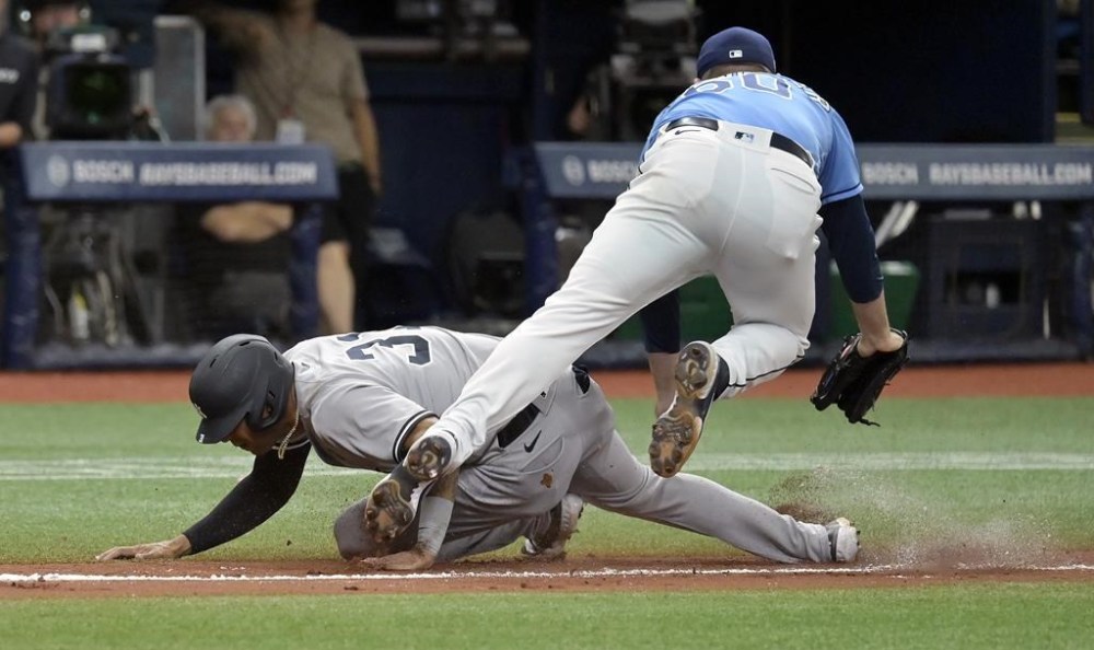 New York Yankees' Aaron Hicks, left, upends Tampa Bay Rays relief pitcher Garrett Cleavinger during a run down between home plate and third base during the tenth inning of a baseball game, Sunday, May 7, 2023, in St. Petersburg, Fla. (AP Photo/Steve Nesius)