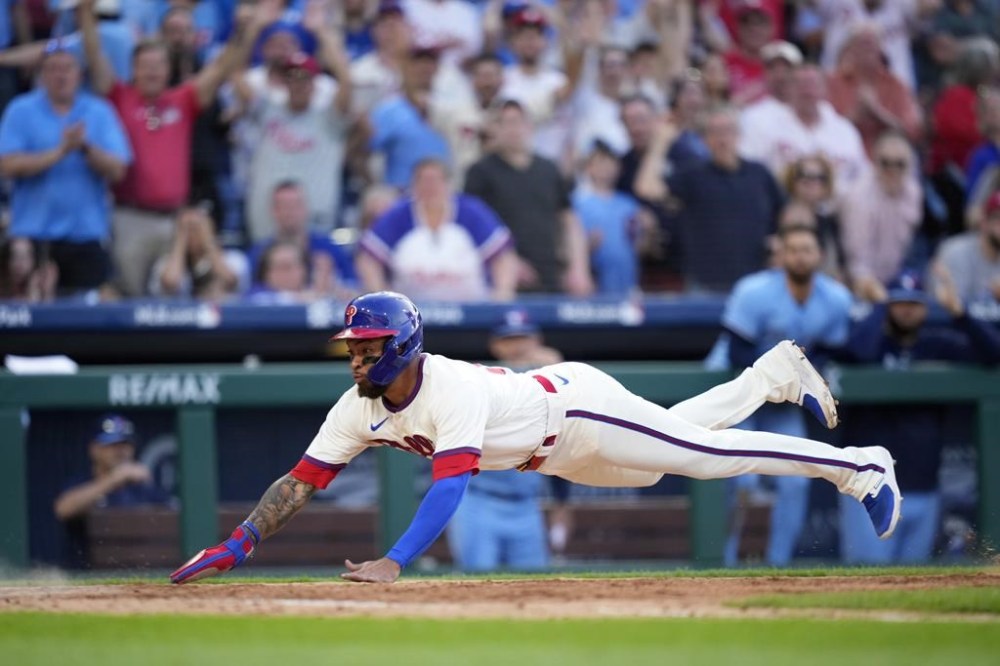 PHILADELPHIA (AP) — Edmundo Sosa scored on Bryce Harper’s hard-hit grounder in the 10th inning after Toronto shortstop Bo Bichette’s throwing error and the Philadelphia Phillies came back to defeat the Blue Jays 2-1 on Wednesday.