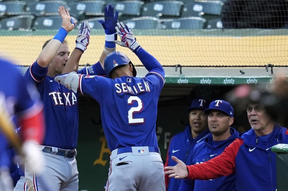 Texas Rangers' Marcus Semien, center, celebrates with teammates at the dugout after hitting a solo home run against the Oakland Athletics during the sixth inning of a baseball game in Oakland, Calif., Thursday, May 11, 2023. (AP Photo/Godofredo A. Vásquez)