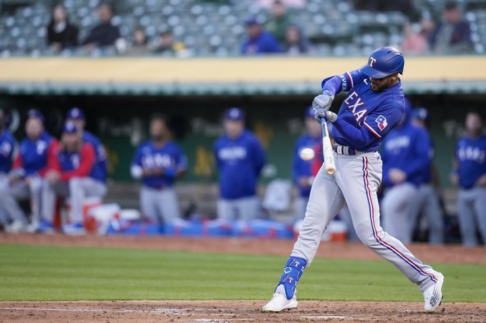 Texas Rangers' Leody Taveras hits an RBI single against the Oakland Athletics during the fifth inning of a baseball game in Oakland, Calif., Thursday, May 11, 2023. (AP Photo/Godofredo A. Vásquez)