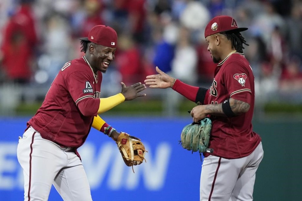 Arizona Diamondbacks' Geraldo Perdomo, left, and Ketel Marte celebrate after the Diamondbacks won a baseball game against the Philadelphia Phillies, Tuesday, May 23, 2023, in Philadelphia. (AP Photo/Matt Slocum)