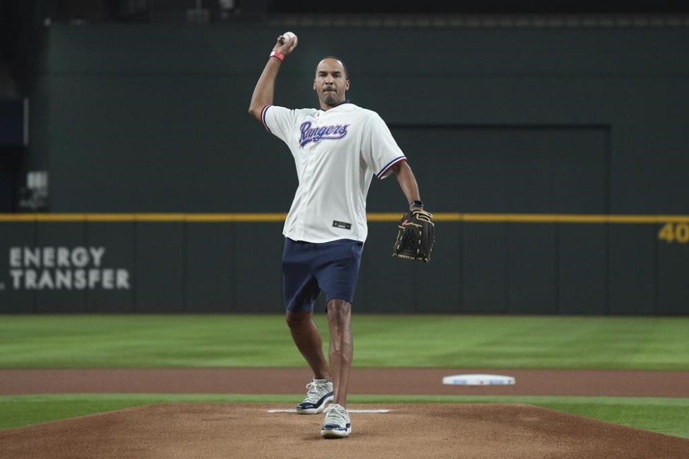 Dallas Mavericks general manager Nico Harrison throws out the first pitch before a baseball game between the Detroit Tigers and the Texas Rangers in Arlington, Texas, Wednesday, June 28, 2023. (AP Photo/LM Otero)