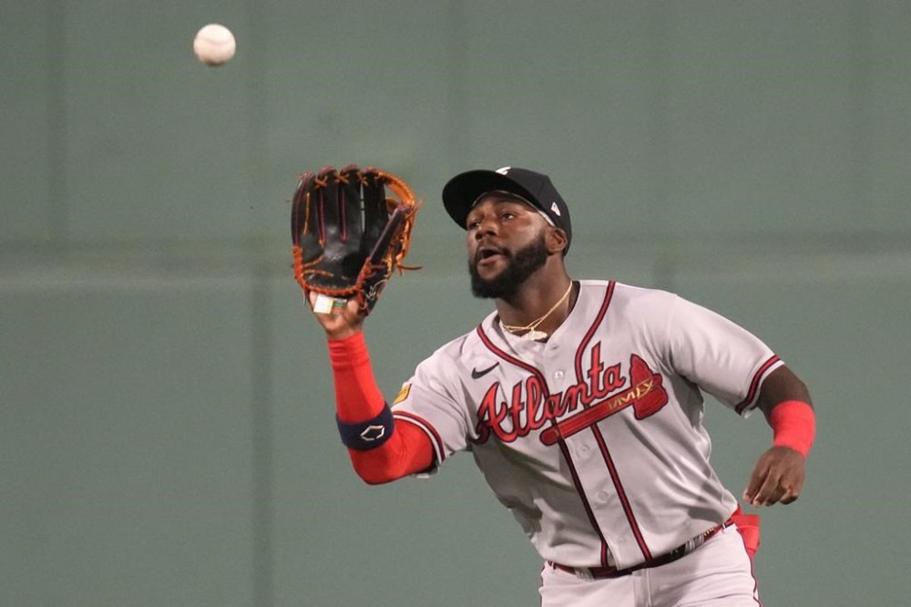 Center fielder Michael Harris caught a shallow fly by Triston Casas and threw to first after Adam Duvall had strayed too far.