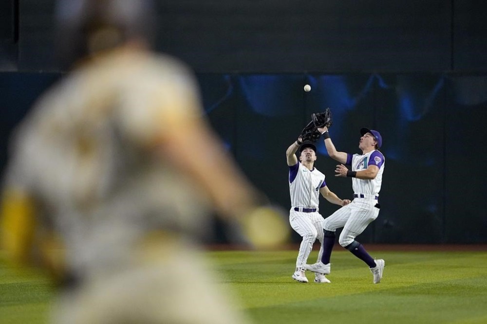 Arizona Diamondbacks' Jake McCarthy, right, catches a fly-out by San Diego Padres' Ha-Seong Kim as he avoids colliding with teammate Corbin Carroll during the third inning of a baseball game, Saturday, Aug. 12, 2023, in Phoenix. (AP Photo/Matt York)