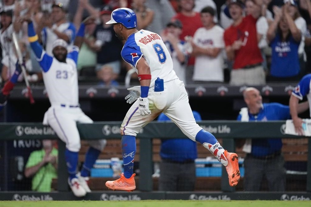 Rosario drove in three runs, including a run-scoring double in the second. He singled and scored on Travis d’Arnaud’s double in the fourth.