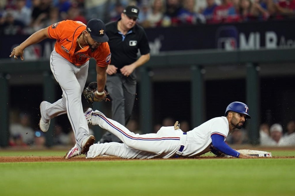 The Texas Rangers baserunner was sliding back to the bag at first base after Houston’s José Abreu snagged Corey Seager’s 108.6 mph liner in the fifth inning Thursday night.