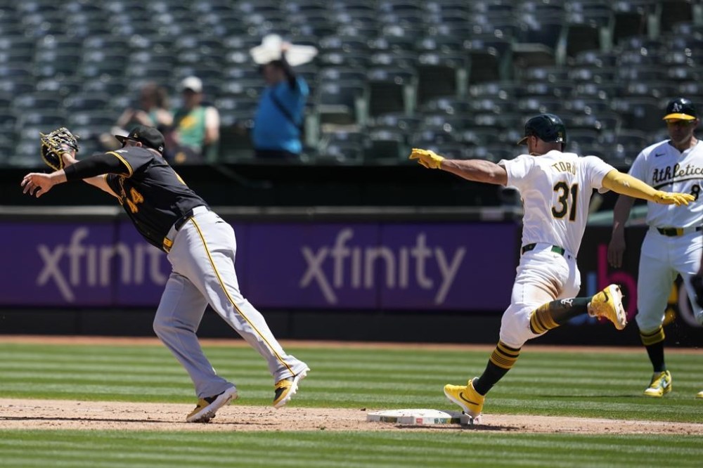 The Pirates missed a chance to score in the fourth inning when the A’s made a pair of errors after Cruz’s leadoff single. With a runner on third base, Oakland shortstop Darrell Hernaiz fielded Tellez’s grounder and threw home to get Cruz sliding across the plate.
