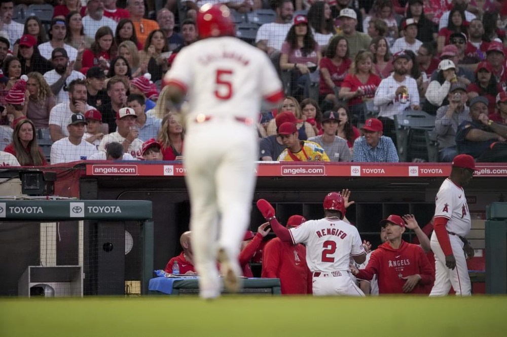 The Angels took the lead with a pair in the third. Nolan Schanuel came home after Olson threw a wild pitch with the bases loaded and Willie Calhoun’s grounder drove in Luis Rengifo.