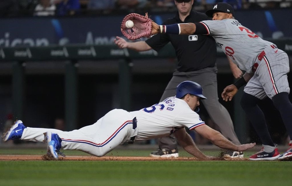 ARLINGTON, Texas (AP) — Willi Castro drove in two runs with a bases-loaded single and another Minnesota run scored on the play due to a throwing error as the Twins rallied to beat the slumping Texas Rangers 5-2 on Saturday night.
