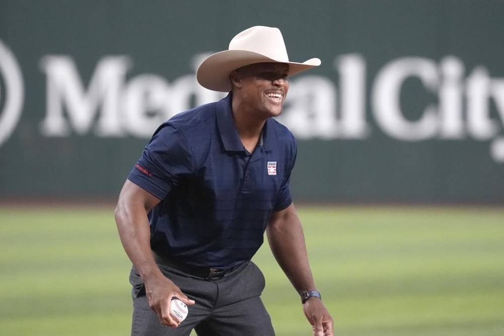 Former Texas Rangers third baseman Adrian Beltre smiles during for a ceremony to honor his induction into the Hall of Fame before a baseball game between the Minnesota Twins and the Rangers in Arlington, Texas, Saturday, Aug. 17, 2024. (AP Photo/LM Otero)