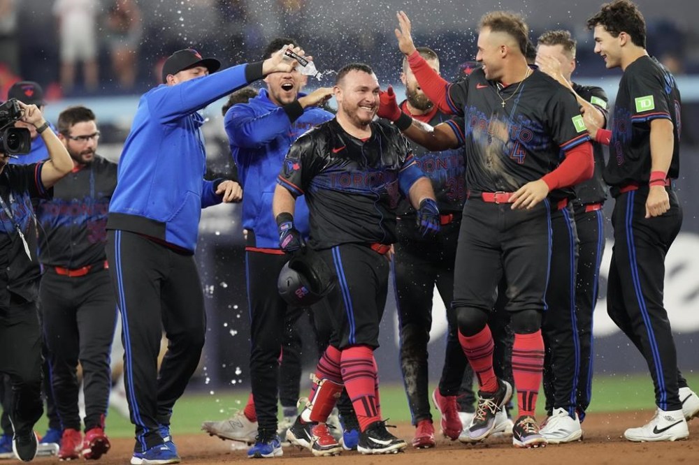 Toronto Blue Jays' Alejandro Kirk is congratulated by teammates after hitting a walk-off RBI single against the St. Louis Cardinals during eleventh inning interleague MLB baseball action in Toronto, Friday, September 13, 2024. THE CANADIAN PRESS/Chris Young