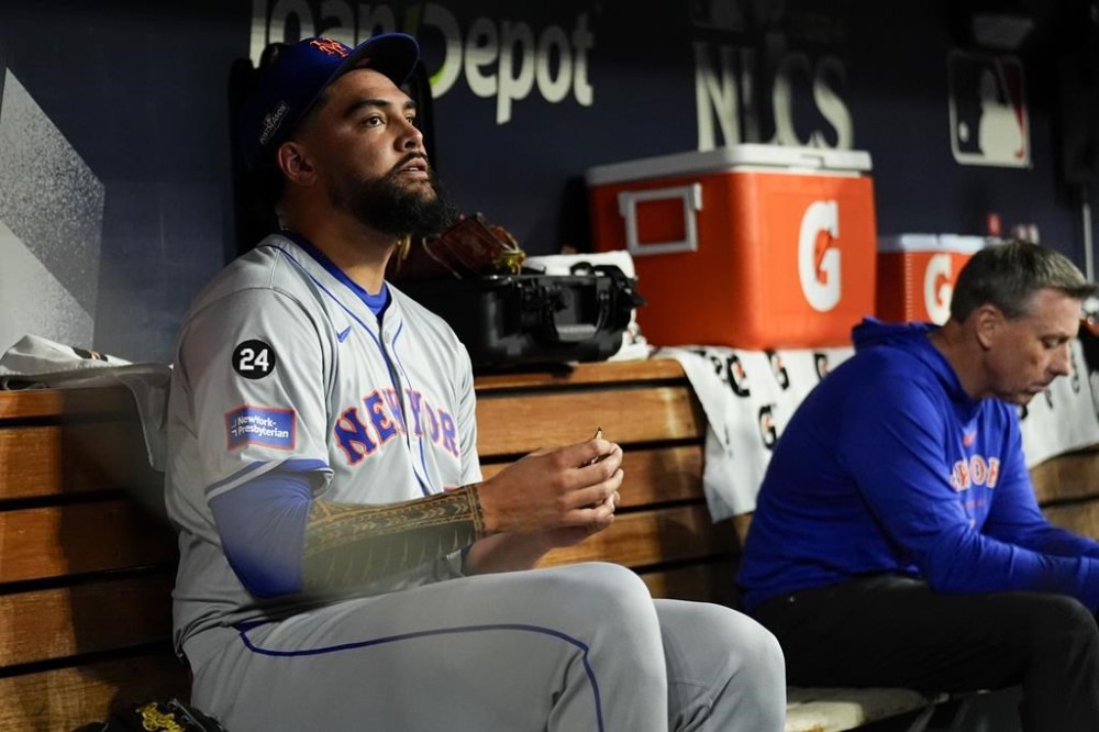 New York Mets pitcher Sean Manaea sits in the dugout after leaving the game against the Los Angeles Dodgers in Game 6 of a baseball NL Championship Series, Sunday, Oct. 20, 2024, in Los Angeles. (AP Photo/Julio Cortez)