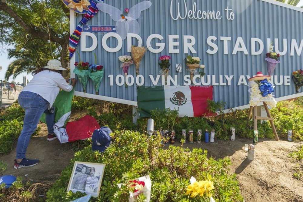 Cristina Vargas from North Hollywood, places a Mexican flag among baseball memorabilia, flowers, and candles placed outside Dodger Stadium after the death of former Dodgers pitcher Fernando Valenzuela Wednesday, Oct. 23, 2024, in Los Angeles. Valenzuela, the Mexican-born phenom for the Los Angeles Dodgers who inspired "Fernandomania" while winning the NL Cy Young Award and Rookie of the Year in 1981, died Tuesday, Oct. 22, 2024. (AP Photo/Damian Dovarganes)