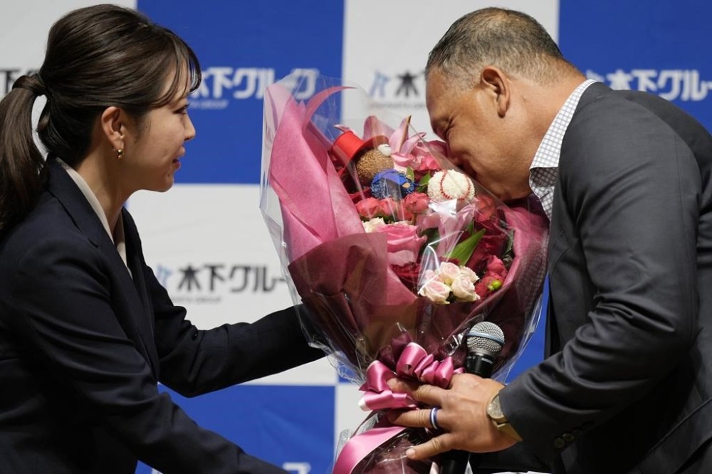 Los Angeles Dodgers manager Dave Roberts smells the bouquet of flowers he received during a press conference on the commercials he appears Wednesday, Dec. 4, 2024, in Tokyo. (AP Photo/Eugene Hoshiko)