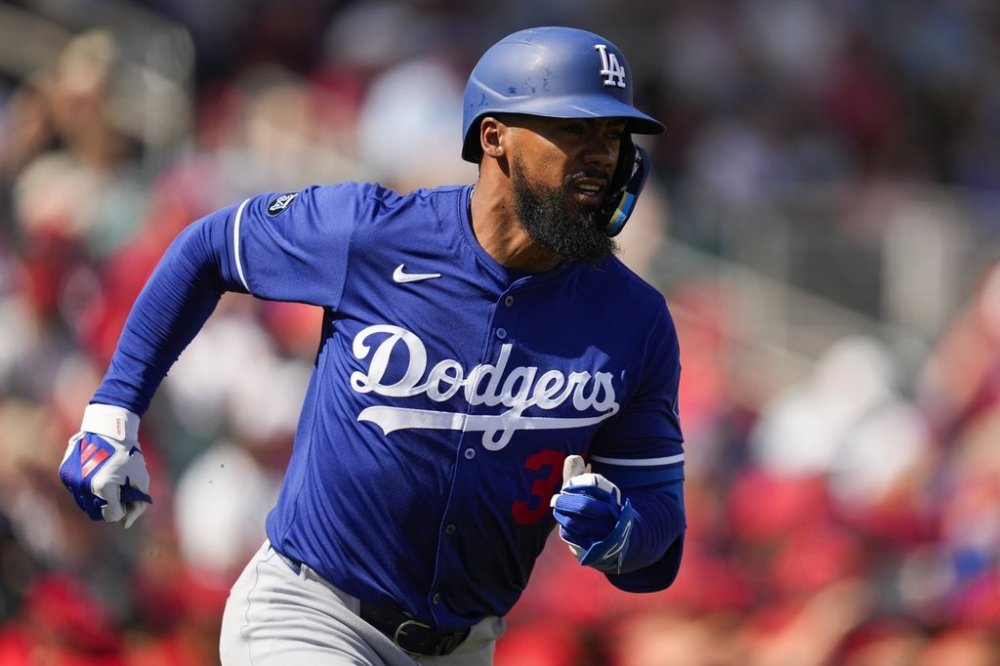 Los Angeles Dodgers' Teoscar Hernandez runs to first on a single during the first inning of a spring training baseball game against the Cincinnati Reds, Monday, Feb. 24, 2025, in Goodyear, Ariz. (AP Photo/Ashley Landis)
