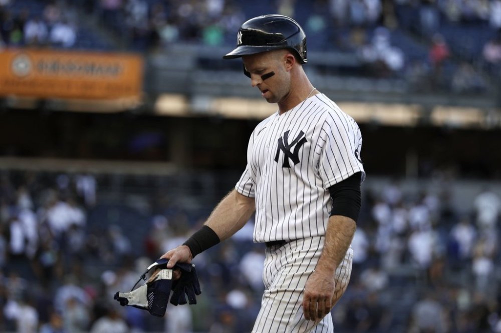 FILE - New York Yankees' Brett Gardner walks off the field after being defeated by the Tampa Bay Rays in a baseball game on Saturday, Oct. 2, 2021, in New York. (AP Photo/Adam Hunger, File)