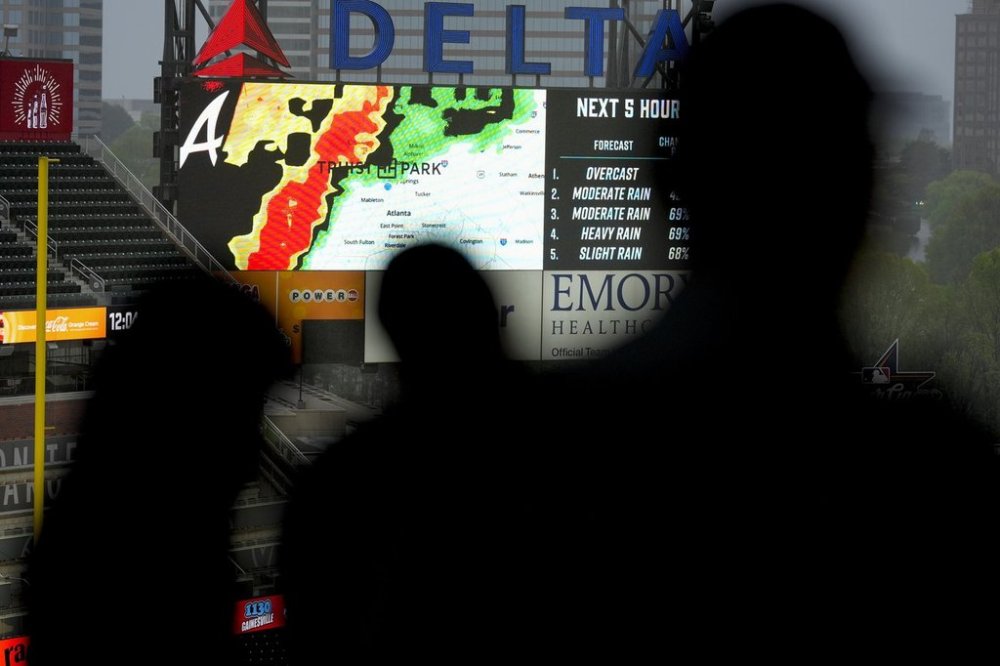 Atlanta’s grounds crew covered the infield with a tarp about 2 hours before the scheduled first pitch. Light rain began about 30 minutes later, and heavy rain was forecast through the afternoon.
