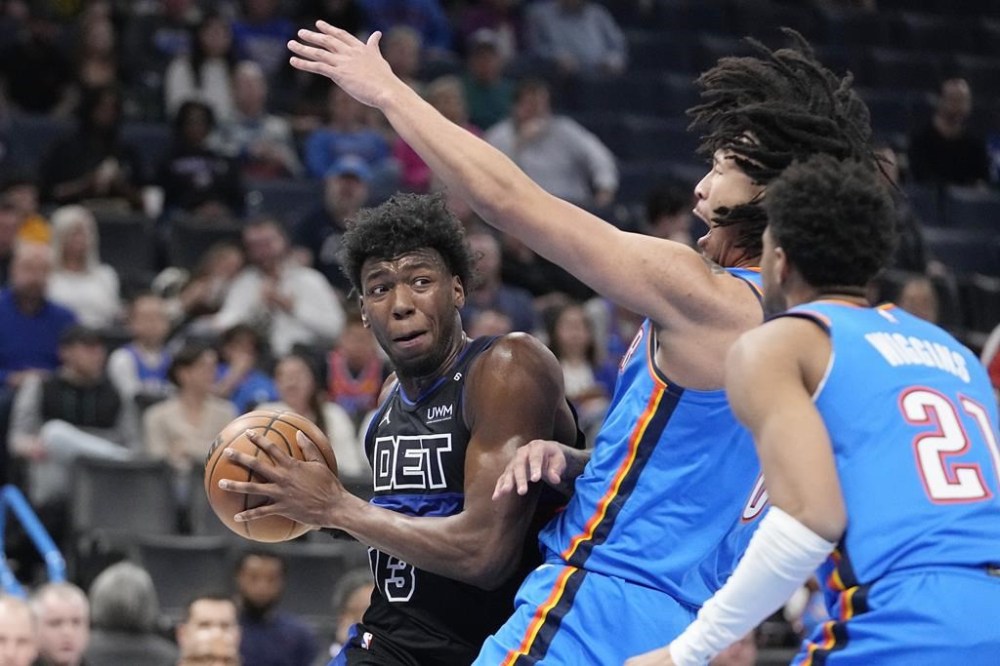 Detroit Pistons center James Wiseman, left, drives against Oklahoma City Thunder forward Jaylin Williams, center, in the first half of an NBA basketball game Wednesday, March 29, 2023, in Oklahoma City. (AP Photo/Sue Ogrocki)