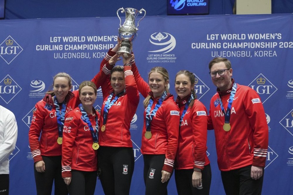 Canada's skip Rachel Homan, Tracy Fleury, Emma Miskew, Sarah Wilkes, Rachel Brown and coach Viktor Kjell, from left to right, pose for the photographers after winning the gold medal match against Switzerland at the World Women's Curling Championship in Uijeongbu, South Korea, Sunday, March 23, 2025. (AP Photo/Lee Jin-man)