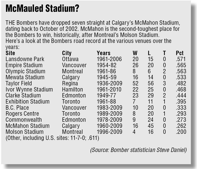 The Bombers have dropped seven straight at Calgary’s McMahon Stadium, dating back to October of 2002. McMahon is the second-toughest place for the Bombers to win, historically, after Montreal’s Molson Stadium.