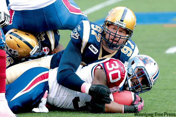 Winnipeg Blue Bombers� Doug Brown takes down Montreal Alouettes� RB Dahrran Diedrick at Canad Inns Stadium on Saturday afternoon.