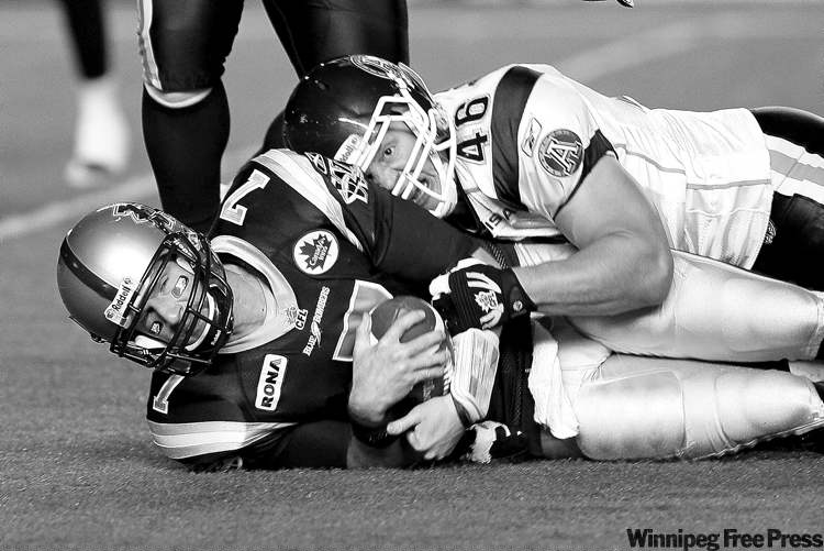 FINE TIME: Expect the league to hand out a fine to Winnipeg defensive back Johnny Sears for his helmet-to-helmet hit on Toronto quarterback Steven Jyles this week.
