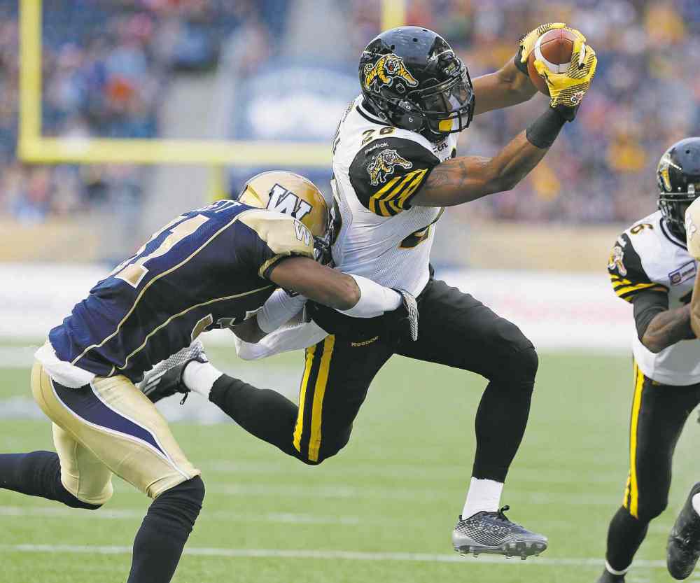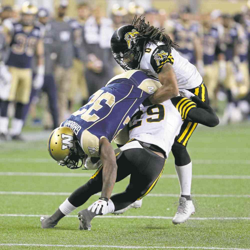 Hamilton Tiger-Cats Ed Gainey (29) and Rico Murray hit Winnipeg Blue Bombers' Nic Grigsby during second-half action Saturday night.