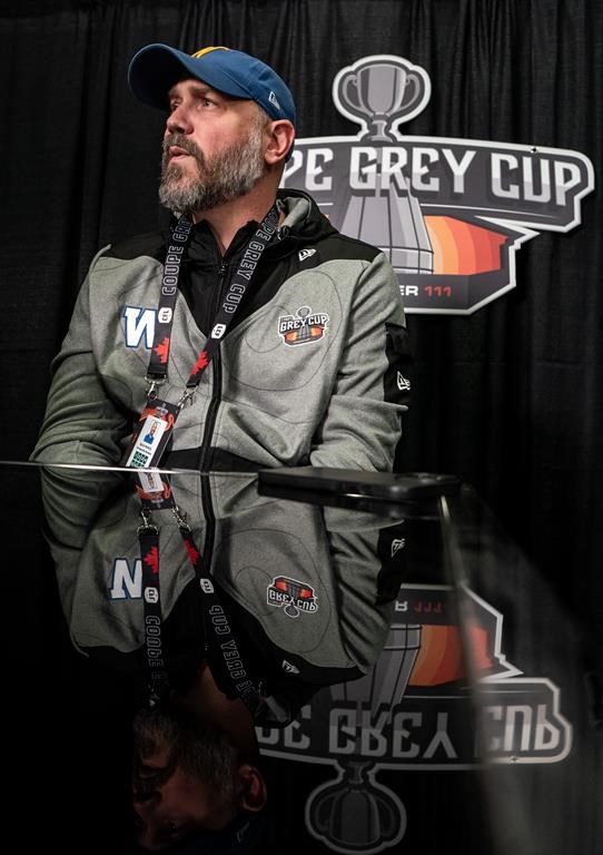 Winnipeg Blue Bombers offensive co-ordinator Buck Pierce speaks to reporters during media day ahead of the 111th CFL Grey Cup, in Vancouver, on Wednesday, November 13, 2024. THE CANADIAN PRESS/Ethan Cairns