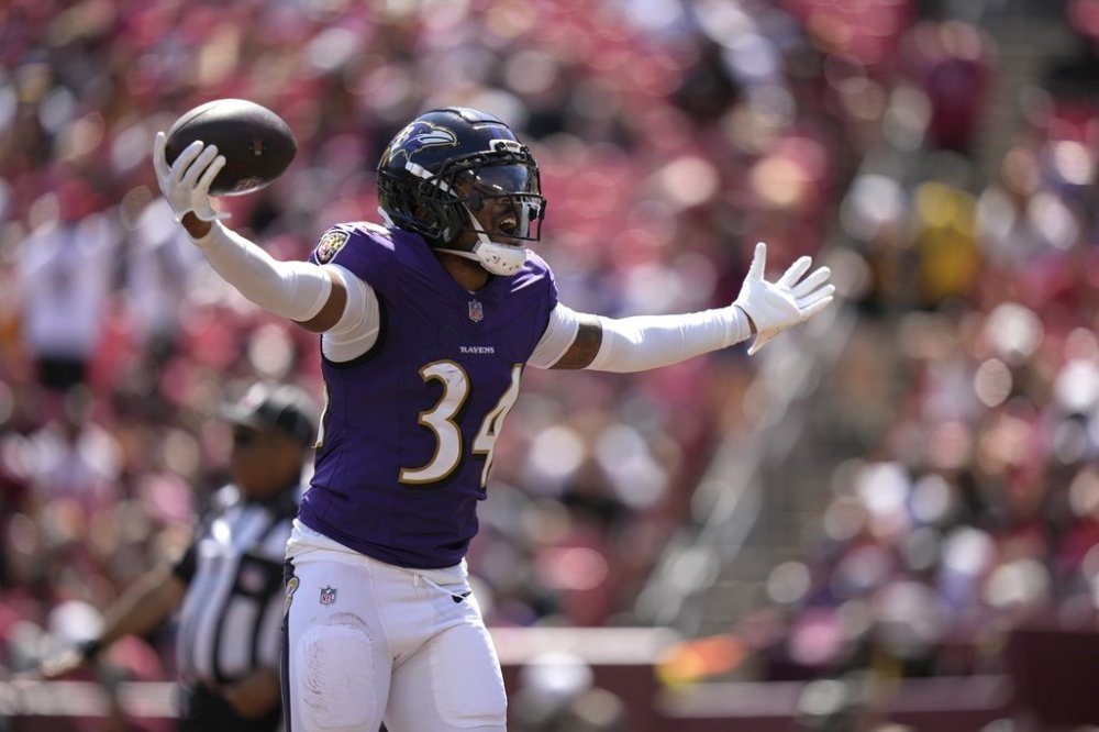 Baltimore Ravens cornerback Thomas Graham Jr. celebrates after intercepting a pass during the second half of a preseason NFL football game Saturday, Aug. 23, 2025, in Landover, Md. (AP Photo/Stephanie Scarbrough)