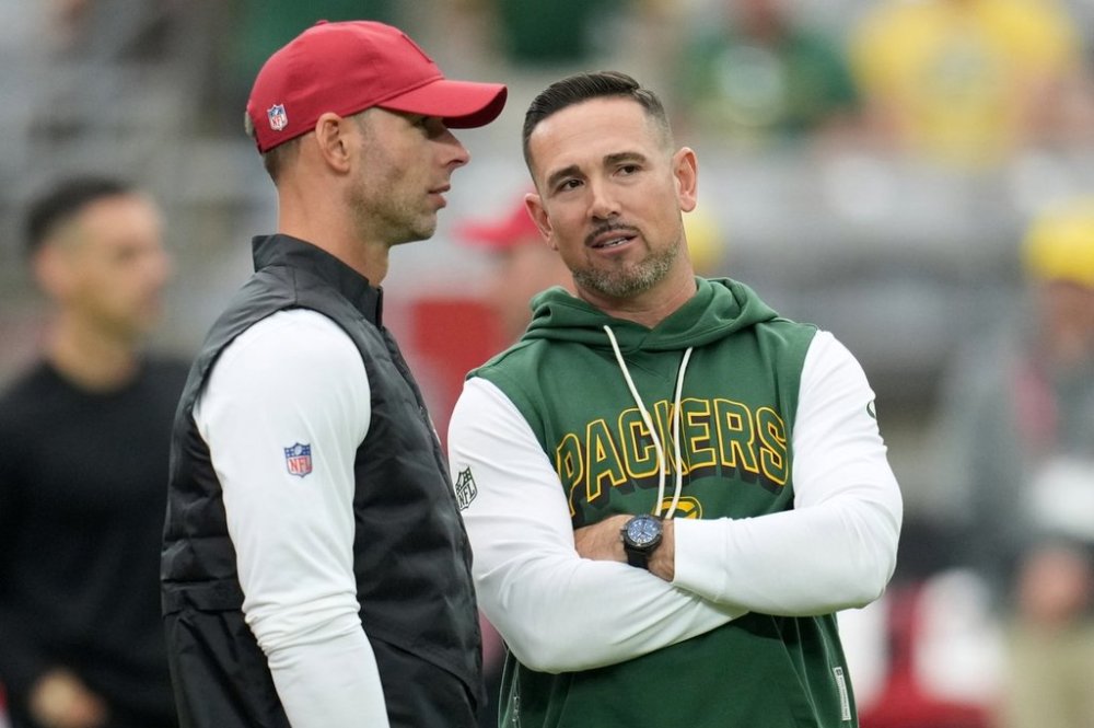 Arizona Cardinals head coach Jonathan Gannon talks to Green Bay Packers head coach Matt Lafleur before an NFL football game Sunday, Oct. 19, 2025, in Glendale, Ariz. (AP Photo/Ross D. Franklin)