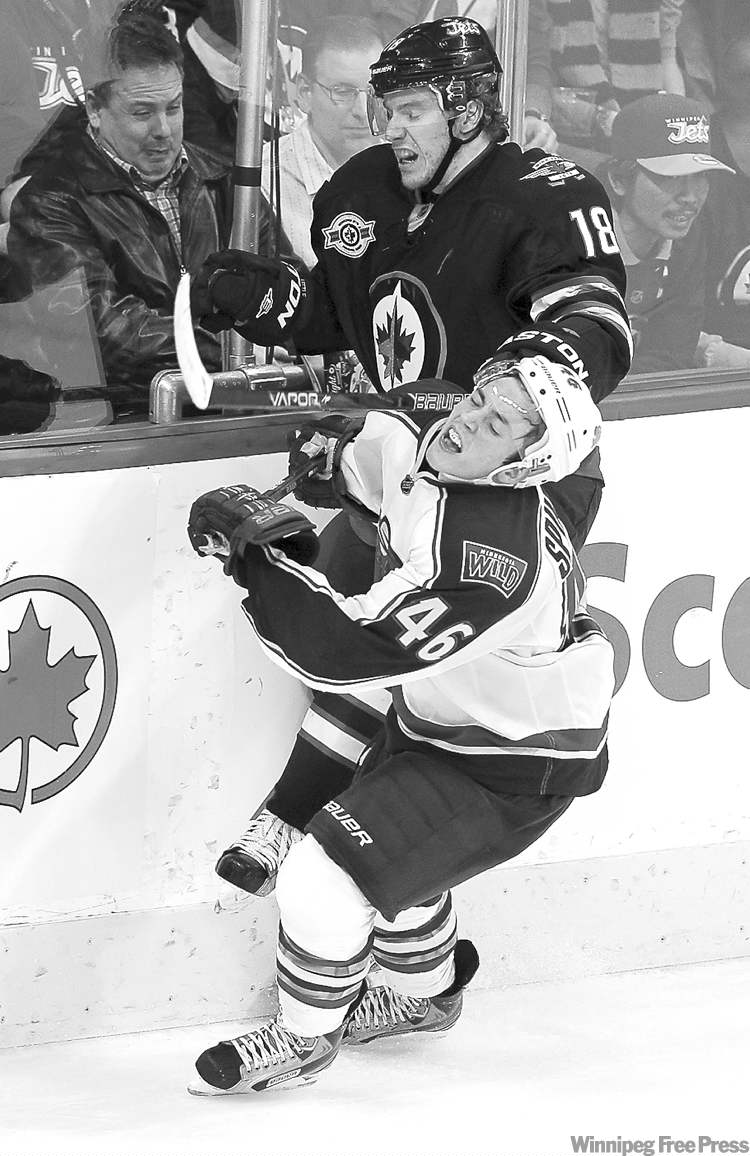 And so it was Saturday night against the Anaheim Ducks as Alex Burmistrov, Nik Antropov and Toby Enstrom returned to action, but Bryan Little was lost after he took a shot off the back in the first period. Little, said head coach Claude Noel, will be day-to-day until the extent of the injury is further examined.