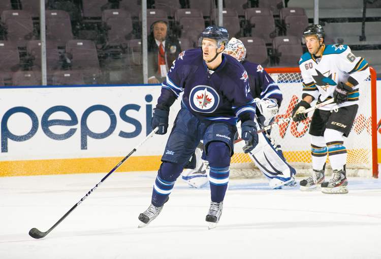Winnipeg prospect Ivan Telegin, shown here in a Young Stars Classic game vs. San Jose, has speed to burn and is just starting to pick up the nuances of the NHL game.